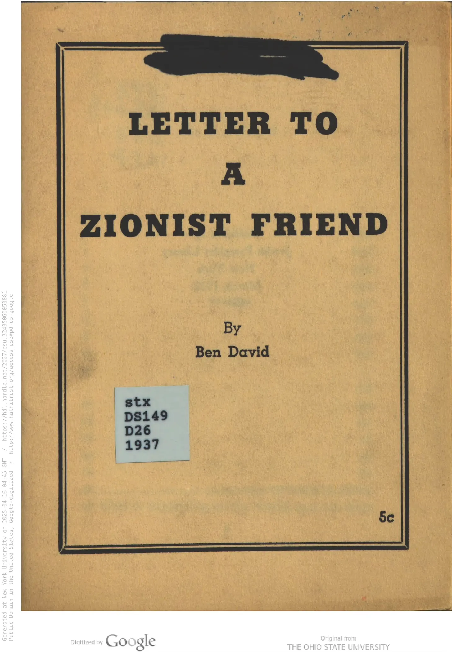 Recently, I came across a 1937 pamphlet titled A Letter to a Zionist Friend by an author named Ben David. It was digitized by Google and made available through the HathiTrust Digital Library. I’m sharing it here in full because of how powerfully it reflects the debates around Zionism, Jewish identity, and the future of Palestine that were already deeply active nearly 90 years ago.