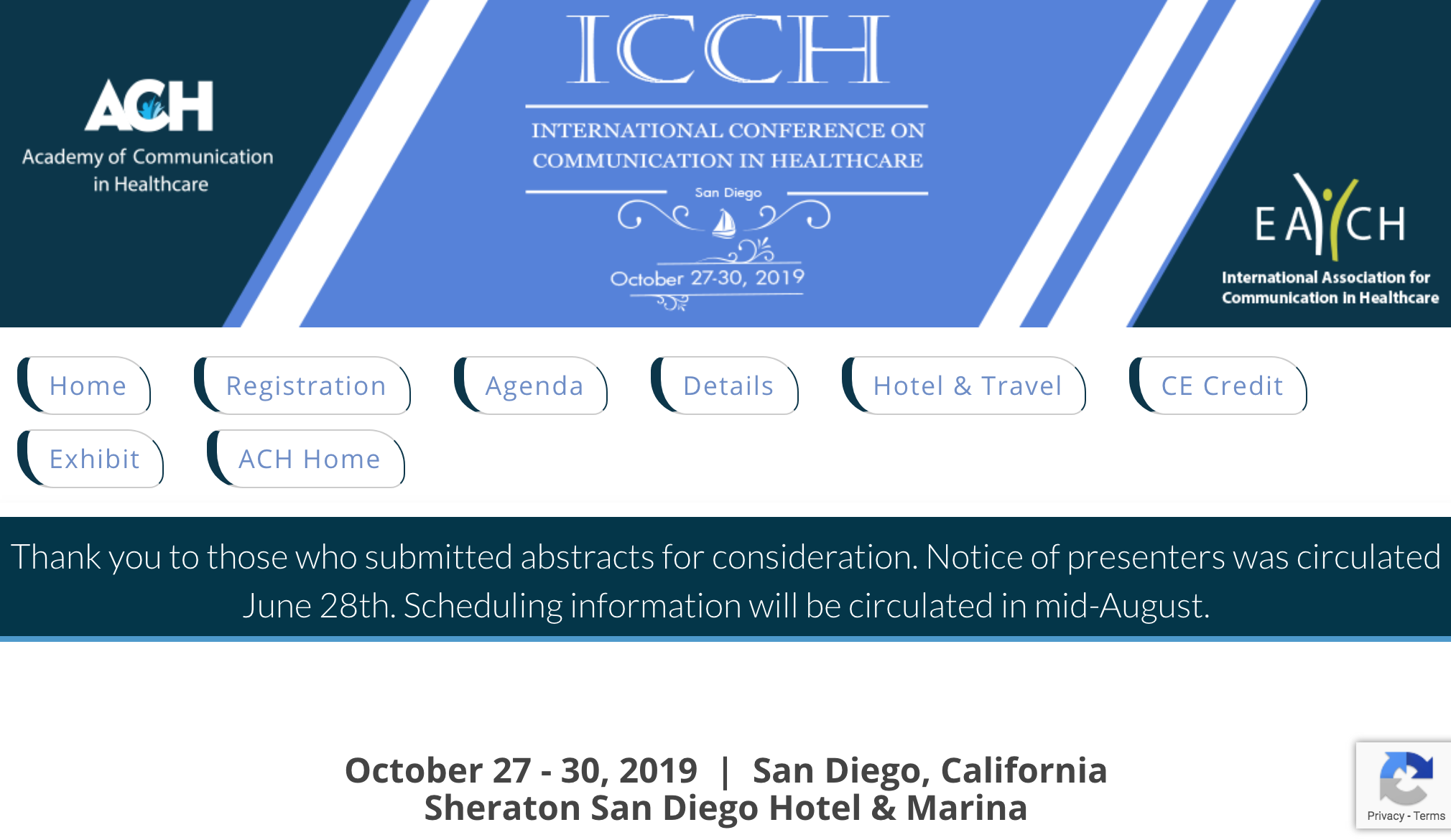 Please join the Academy of Communication in Healthcare (ACH) and EACH: International Association for Communication in Healthcare for the 17th International Conference on Communication in Healthcare (ICCH)! This cutting-edge research and educational event will be held at the Sheraton San Diego Hotel & Marina in San Diego, CA, October 27 – 30, 2019. We are excited that ICCH 2019 is being offered in collaboration with Health Literacy Annual Research Conference (HARC), International Shared Decision Making Society (ISDM), International Health Literacy Association (IHLA) and our colleagues in the field of health communication including those affiliated with KCHC/DCHC.