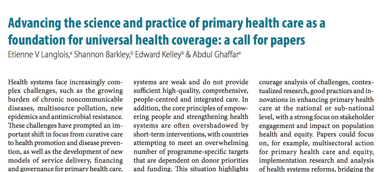 Advancing the science and practice of primary health care as a foundation for universal health coverage: a call for papers Shabir Moosa 7 years ago See this call for papers from WHO on advancing the science and practice of primary health care as a foundation for universal health coverage https://www.who.int/bulletin/volumes/97/8/19-239889.pdf Share this: Share on Facebook (Opens in new window) Facebook Share on X (Opens in new window) X Share on LinkedIn (Opens in new window) LinkedIn Share on Telegram (Opens in new window) Telegram Share on WhatsApp (Opens in new window) WhatsApp Print (Opens in new window) Print Email a link to a friend (Opens in new window) Email Advancing the science and practice of primary health care as a foundation for universal health coverDateAugust 13, 2019In relation toPrimary health careEmpanelment: A Foundational Component of Primary Health CareDateOctober 3, 2019In relation toHealth Systems Science (HSS)Communities, universal health coverage and primary health careDateOctober 19, 2023In relation toPrimary health care