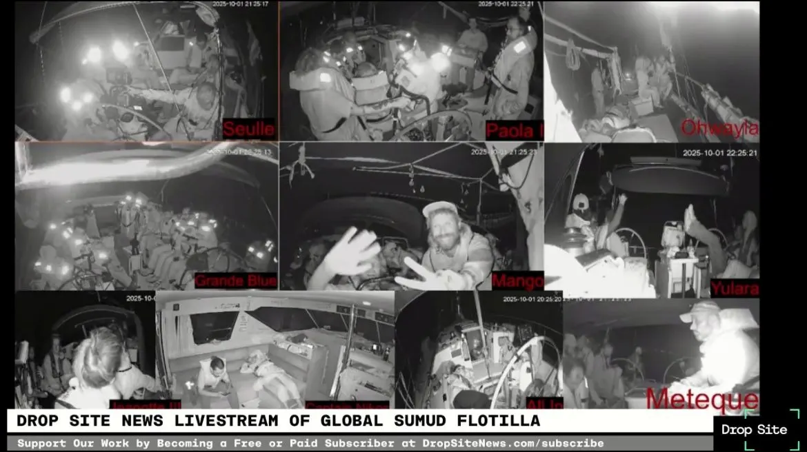 The Israeli military has begun intercepting and illegally boarding boats participating in the Global Sumud Flotilla en route to the Gaza Strip—the largest effort yet to break the Israeli blockade on Gaza. Among the parliamentarians, lawyers, activists and journalists taking part in the flotilla is Drop Site News editor Alex Colston, who has been reporting live on the progress of the flotilla from the Sirius-Haifa boat. The flotilla consists of over 40 boats, with over 500 participants from dozens of countries around the world, attempting to deliver humanitarian aid.