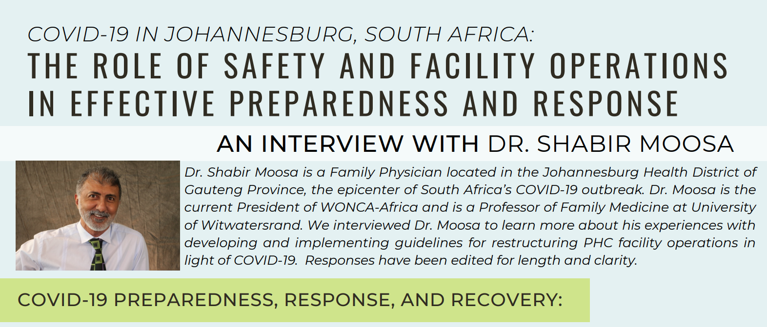 Dr. Shabir Moosa is a Family Physician located in the Johannesburg Health District of Gauteng Province, the epicenter of South Africa’s COVID-19 outbreak. Dr. Moosa is the current President of WONCA-Africa and is a Professor of Family Medicine at University of Witwatersrand. We interviewed Dr. Moosa to learn more about his experiences with developing and implementing guidelines for restructuring PHC facility operations in light of COVID-19. Responses have been edited for length and clarity…..more