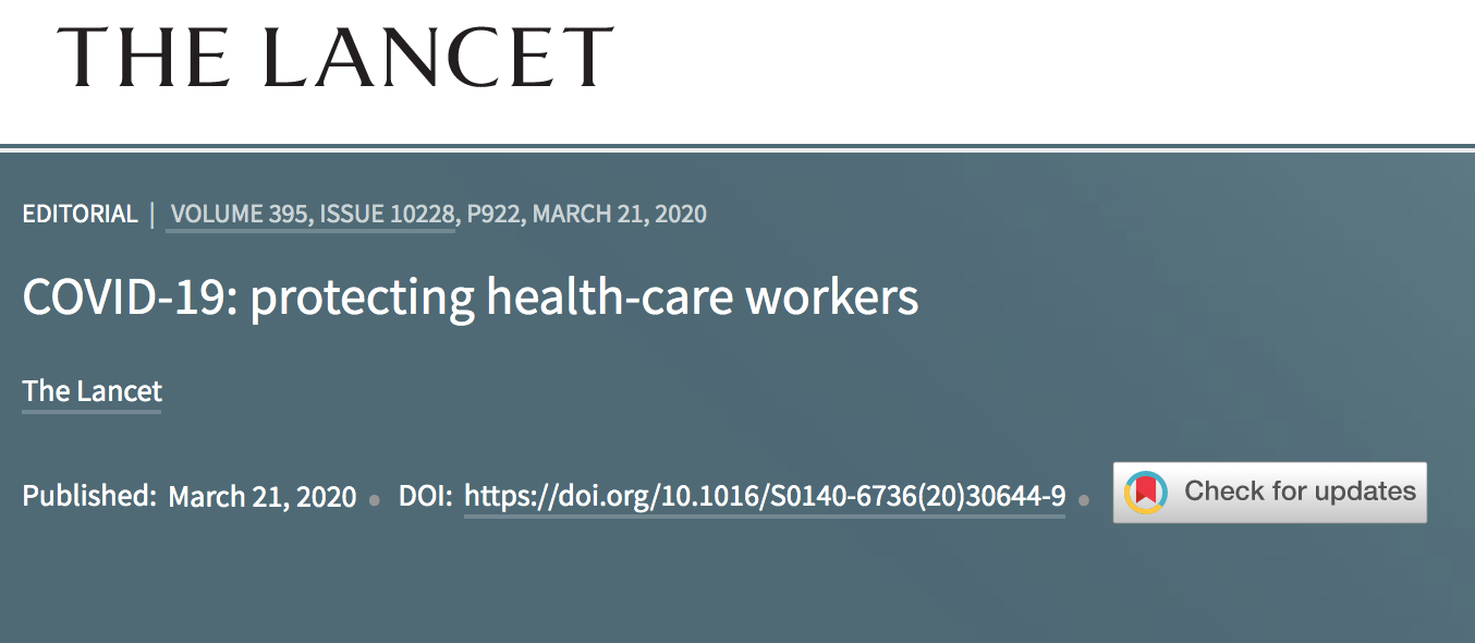 Worldwide, as millions of people stay at home to minimise transmission of severe acute respiratory syndrome coronavirus 2, health-care workers prepare to do the exact opposite. They will go to clinics and hospitals, putting themselves at high risk from COVID-2019. Figures from China’s National Health Commission show that more than 3300 health-care workers have been infected as of early March and, according to local media, by the end of February at least 22 had died. In Italy, 20% of responding health-care workers were infected, and some have died. Reports from medical staff describe physical and mental exhaustion, the torment of difficult triage decisions, and the pain of losing patients and colleagues, all in addition to the infection risk…..more