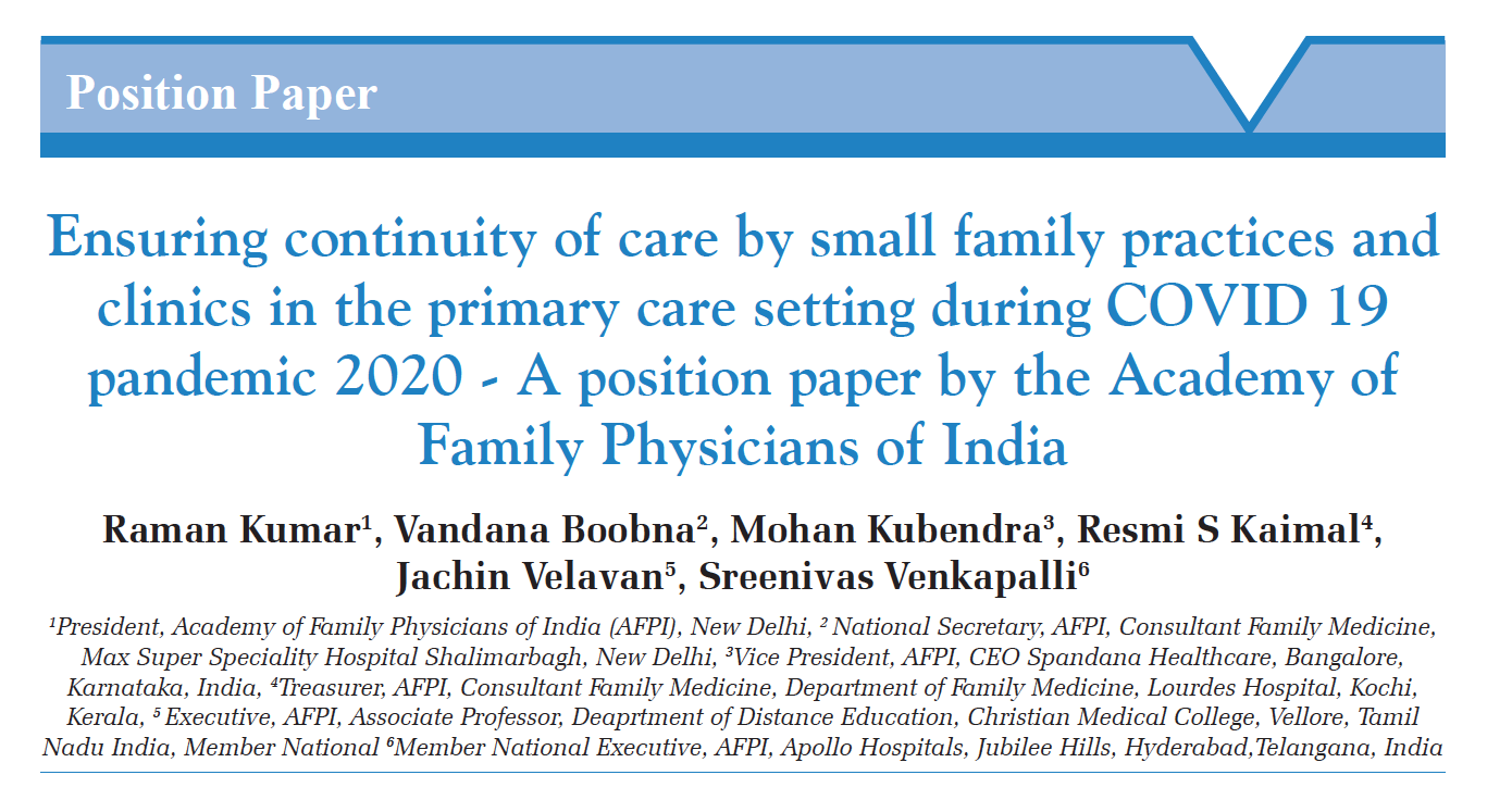 The world is passing through a global pandemic of COVID 19. The number of positive cases has crossed over twenty thousand as of April 2020. Like everyone else, it is indeed a very challenging situation for family physicians and primary care providers as most of the guidelines presently have focused on screening, quarantine, isolation, and hospital‑based management. Limited information or clarity is available on running small private clinics during pandemic times. The key concern is professional obligation versus risks of community transmission. Family physicians see routine flu‑like illnesses throughout the year with seasonal variation within their practices. This document is intended to develop consensus and standard practices for the family physicians and other primary care providers during the pandemic, ensuring optimal continuity of care. This document was reviewed by the national executive of the Academy of Family Physicians of India and approved for dissemination among members. However, due to the dynamic status of the pandemic, all practitioners are advised to closely follow the instructions, guidelines, and advisories of national, state and local health authorities as well.