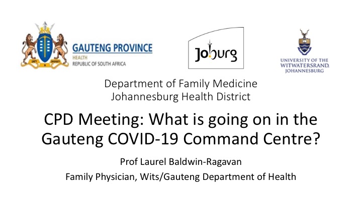 See Prof Laurel Baldwin-Ragavan talk on “Q&A from Gauteng COVID-19 Command Centre” 8.00-9.00am (SAST) on Friday 29th May 2020. Laurel is a family physician and clinical head of Southern Gauteng Health Districts in the Gauteng Department of Health, with a supervisory role over four of the five Departments of Family Medicine in the Province. She is also linked to the University of Witwatersrand.