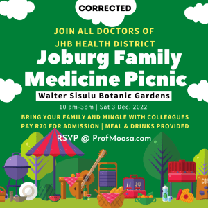 Pls share this invitation with all doctors (incl. interns). Please join us 10am-3pm Saturday 3rd Dec 2022(unless you are on duty!) and chill together at the Walter Sisulu Botanic Gardens in Roodepoort. Bring your family as well. Food and drinks will be provided. You just need to pay for admission to the gardens (R70 adults/ R20 for scholars / children <6 free)). This has been signed off by the Chief Director of Johannesburg Health District in an attempt to acknowledge the hard work of doctors and to support doctors working in clinics, CHCs and hospitals across Jhb. It is also a marvellous opportunity to get to know each other and build relationships, even with doctors in hospitals. All are welcome, even senior officials of Jhb Health District. RSVP with Katlego (katlegomehlape321@gmail.com) or fill the form here.