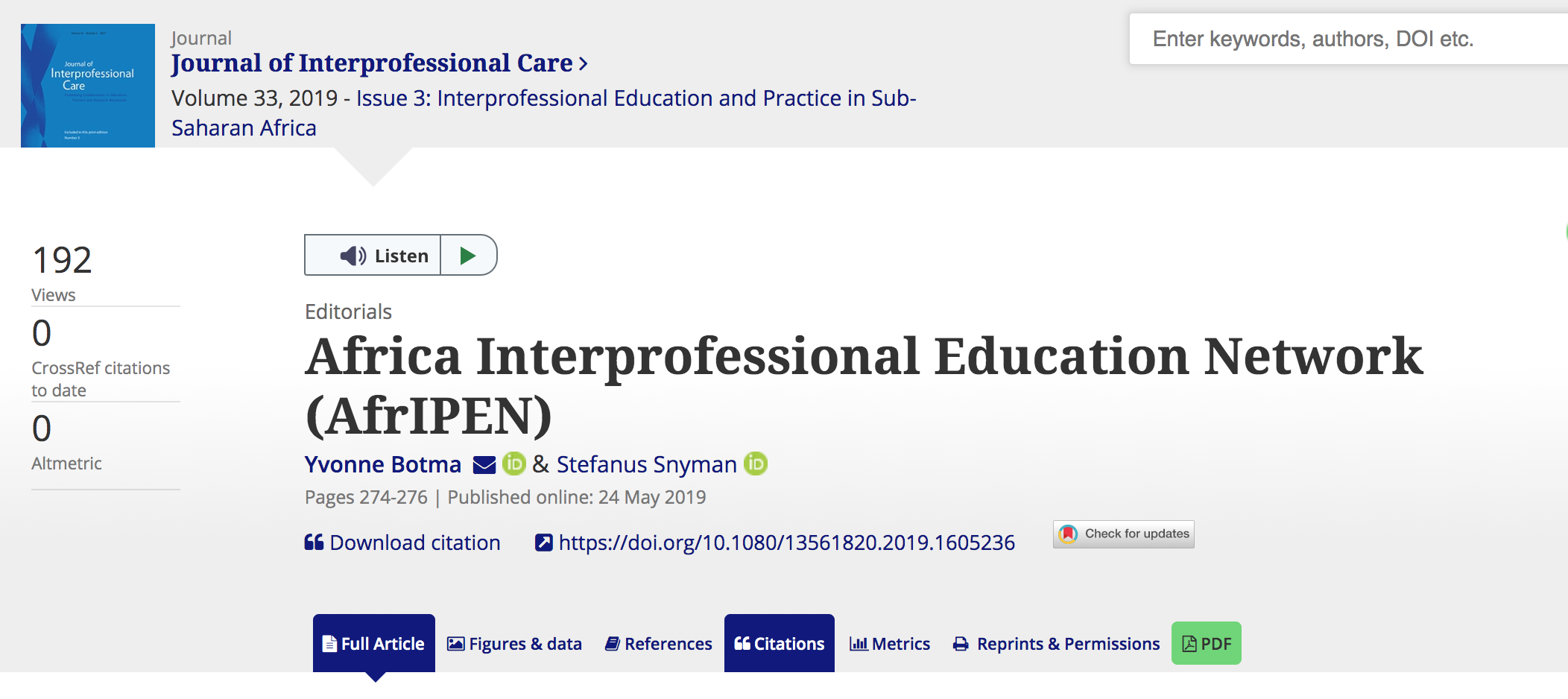 This issue of the Journal of Interprofessional Care publishes for the first time a collection of papers from Sub-Saharan Africa. We are pleased to have contributed to coordinate this issue and write this editorial, which has emerged from a collaborative effort to build a movement around interprofessional practice and education as one way of tackling challenges facing all health and social care professionals in Sub-Saharan Africa…..more