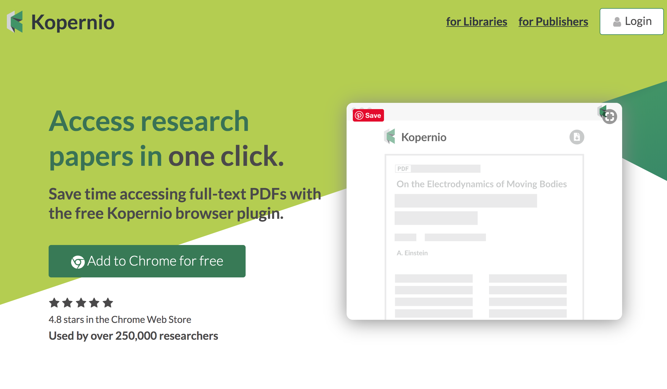 Kopernio Shabir Moosa 6 years ago This is the best online tool for academics since the internet itself. If you search an article online, kopernio tries to find its PDF, which, if found, is then only one click away. http://kopernio.com/invite/89279174 Share this: Share on Facebook (Opens in new window) Facebook Share on X (Opens in new window) X Share on LinkedIn (Opens in new window) LinkedIn Share on Telegram (Opens in new window) Telegram Share on WhatsApp (Opens in new window) WhatsApp Print (Opens in new window) Print Email a link to a friend (Opens in new window) Email Free Online Course: ECG Assessment: an Introduction for Healthcare ProvidersDateSeptember 25, 2015In relation toNewsJoburg makes an early ‘Moov’ into online educationDateAugust 11, 2016In relation toNewsPrimer in Systematic Review Online Short CourseDateSeptember 30, 2018In relation toSimilar post
