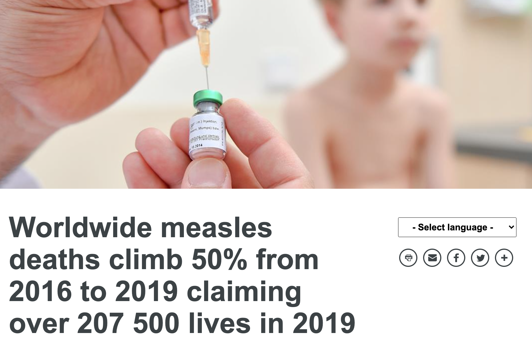 Measles surged worldwide in 2019 reaching highest number of reported cases in 23 years. Highlighted in a publication by WHO and the United States Centers for Disease Control and Prevention (CDC), measles cases worldwide increased to 869 770 in 2019, the highest number reported since 1996 with increases in all WHO regions. Global measles deaths climbed nearly 50 percent since 2016, claiming an estimated 207 500 lives in 2019 alone.