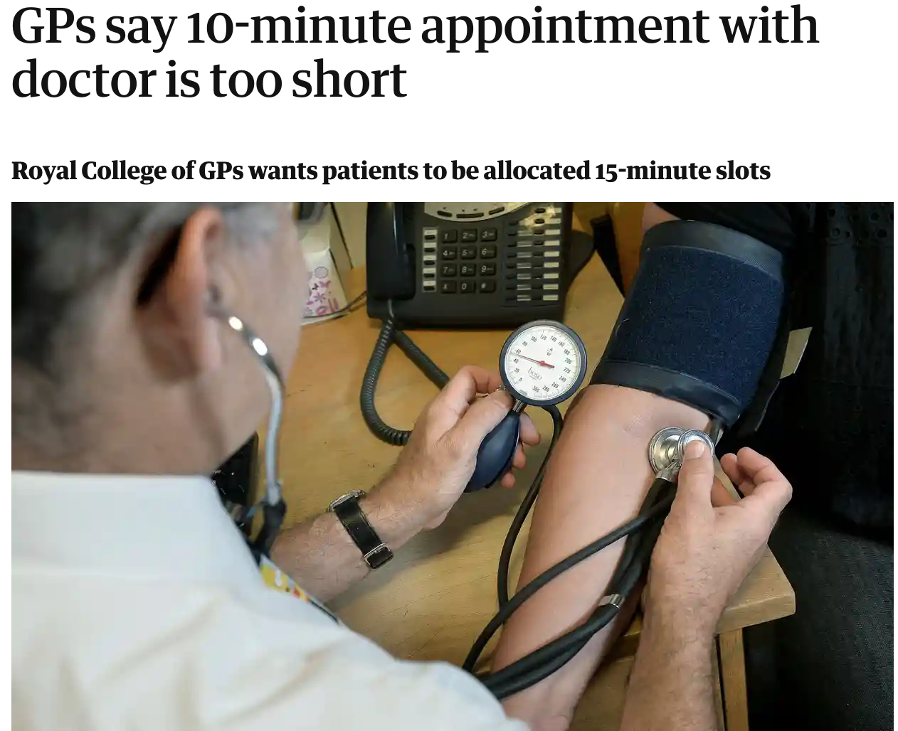 The Guardian reports that the 10-minute appointment that is usual across the National Health Service (NHS) is no longer adequate given the growing number of people who have several long-term illnesses, according to a report from the Royal College of GPs. However, while longer consultations are needed to ensure proper patient care, they will only be possible if the staffing of GP surgeries increases significantly, the college admits. ….more