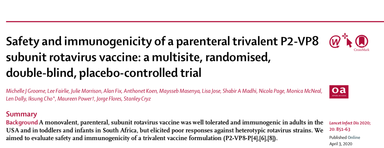 Methods A double-blind, randomised, placebo-controlled, dose-escalation, phase 1/2 study was done at three South African research sites. Healthy adults (aged 18–45 years), toddlers (aged 2–3 years), and infants (aged 6–8 weeks, ≥37 weeks’ gestation, and without previous receipt of rotavirus vaccination), all without HIV infection, were eligible for enrolment. In the dose-escalation phase, adults and toddlers were randomly assigned in blocks (block size of five) to receive 30 μg or 90 μg of vaccine, or placebo, and infants were randomly assigned in blocks (block size of four) to receive 15 μg, 30 μg, or 90 μg of vaccine, or placebo. In the expanded phase, infants were randomly assigned in a 1:1:1:1 ratio to receive 15 μg, 30 μg, or 90 μg of vaccine, or placebo, in block sizes of four. Participants, parents of participants, and clinical, data, and laboratory staff were masked to treatment assignment. Adults received an intramuscular injection of vaccine or placebo in the deltoid muscle on the day of randomisation (day 0), day 28, and day 56; toddlers received a single injection of vaccine or placebo in the anterolateral thigh on day 0. Infants in both phases received an injection of vaccine or placebo in the anterolateral thigh on days 0, 28, and 56, at approximately 6, 10, and 14 weeks of age. Primary safety endpoints were local and systemic reactions (grade 2 or worse) within 7 days and adverse events and serious adverse events within 28 days after each injection in all participants who received at least one injection. Primary immunogenicity endpoints were analysed in infants in either phase who received all planned injections, had blood samples analysed at the relevant timepoints, and presented no major protocol violations considered to have an effect on the immunogenicity results of the study, and included serum anti-P2-VP8 IgA, IgG, and neutralising antibody geometric mean titres and responses measured 4 weeks after the final injection in vaccine compared with placebo groups. This trial is registered with ClinicalTrials.gov, NCT02646891.