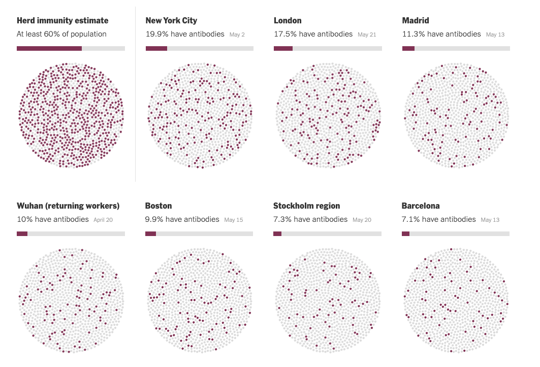 Official case counts often substantially underestimate the number of coronavirus infections. But in new studies that test the population more broadly, the percentage of people who have been infected so far is still in the single digits. The numbers are a fraction of the threshold known as herd immunity, at which the virus can no longer spread widely. The precise herd immunity threshold for the novel coronavirus is not yet clear; but several experts said they believed it would be higher than 60 percent……more